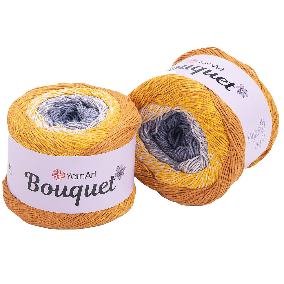 Bouquet - многоцветна кейк прежда в разнообразни хармонични цветови преходи на турския производител Yarn Art. 100% памук и мека текстура за разнообразни плетени изделия като блузи, рокли, шалове и шапки. Чилетата са по 250 г. Плете се с игли или кука номер 4.